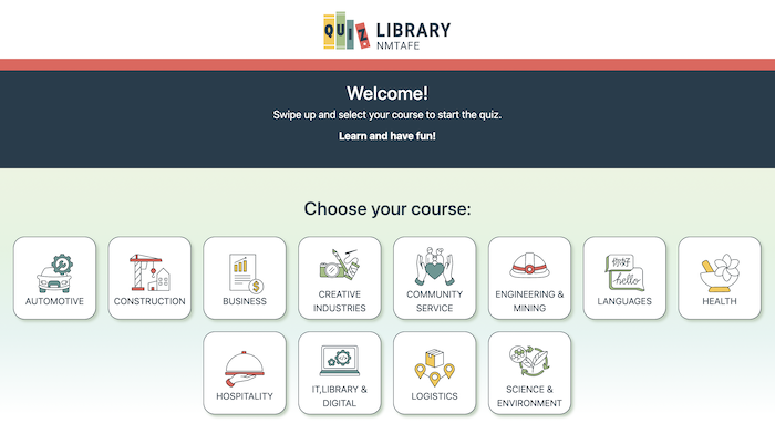 The quiz library is a web application developed from scratch for the Library of NMTAFE. The purpose of this web app is to provide quizzes to learn about the functionality of the library facilities and services. It is meant to be used on the orientation day for the new students, they will need to choose the course they are enrolled in, start the quiz, and walk through the library to find the answers to the questions.